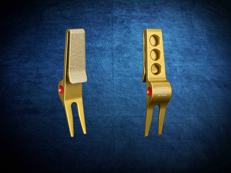 Made with aloha and expertly laser etched to show it, this precision milled aluminum clip pivot tool anodized in misted bright dip gold is a better way to fix ball marks. It also includes our custom made Hawaiian Open Lava Walk design, as well as eye-catching pops of red paint on the milled dots.