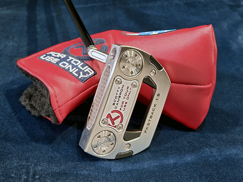 3 Cherry bombs on the backcavity. Circle-T in the left bomb. SCOTTY CAMERON on the heel of the face. SCOTTY CAMERON, FASTBACK1.5 , FOR TOUR USE ONLY, on the sole. Circle-T and 20 on the sole weights. It has a topline. Grip: Circle-T full-contact Black/White Headcover: Induatrial Circle-T USA Red